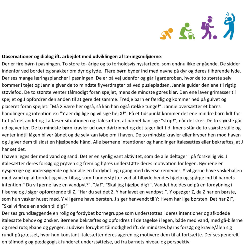 Det er min opfattelse, at der er læring igennem hele dagen, så længe at jeg som voksen er nærværende – både i den leg som børnene selv sætter i gang og jeg som voksen iagttager, det at tage tøj af/på, hjælpe hinanden med eks. jakken, tage tallerken af bordet, rydde legetøjet op osv.